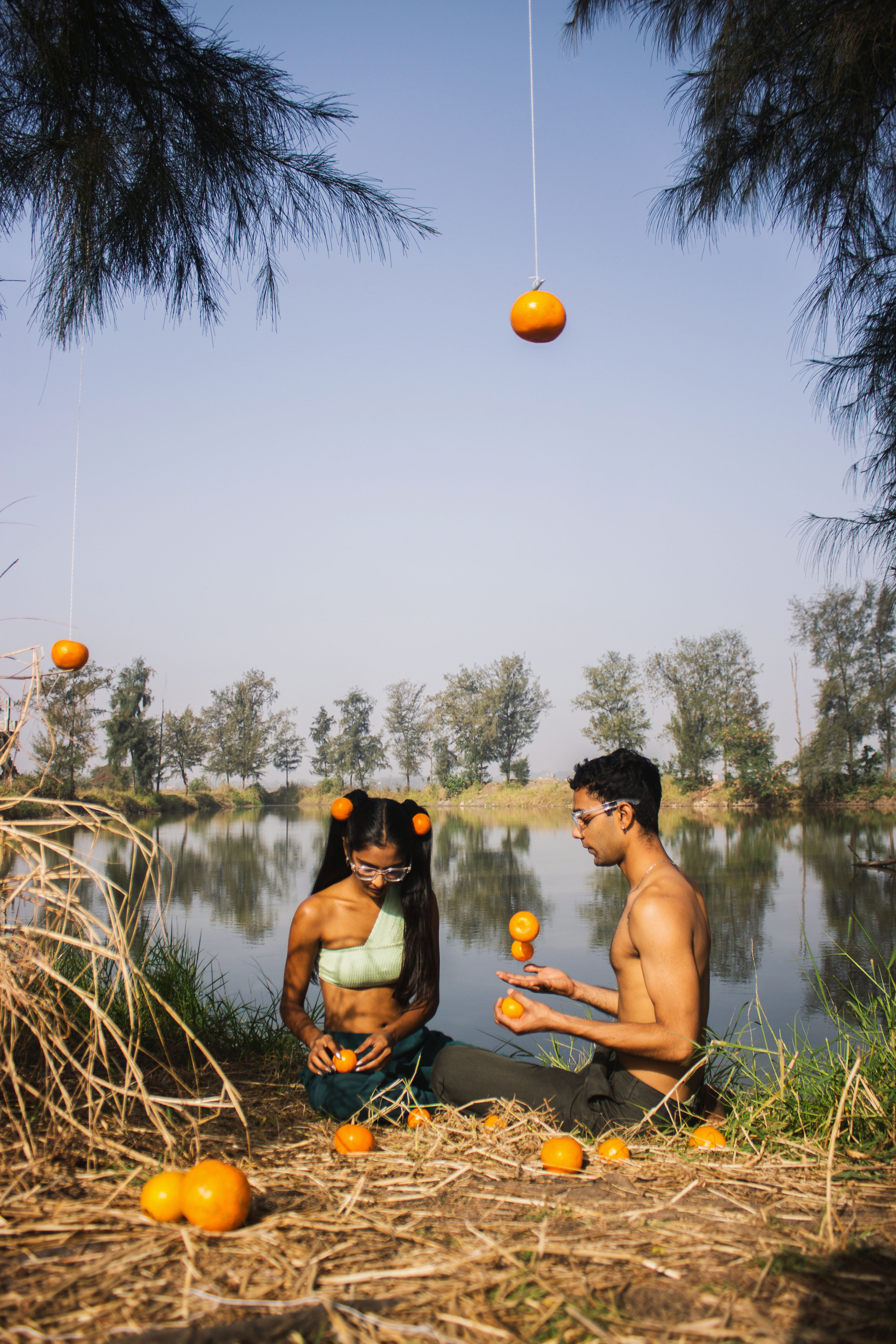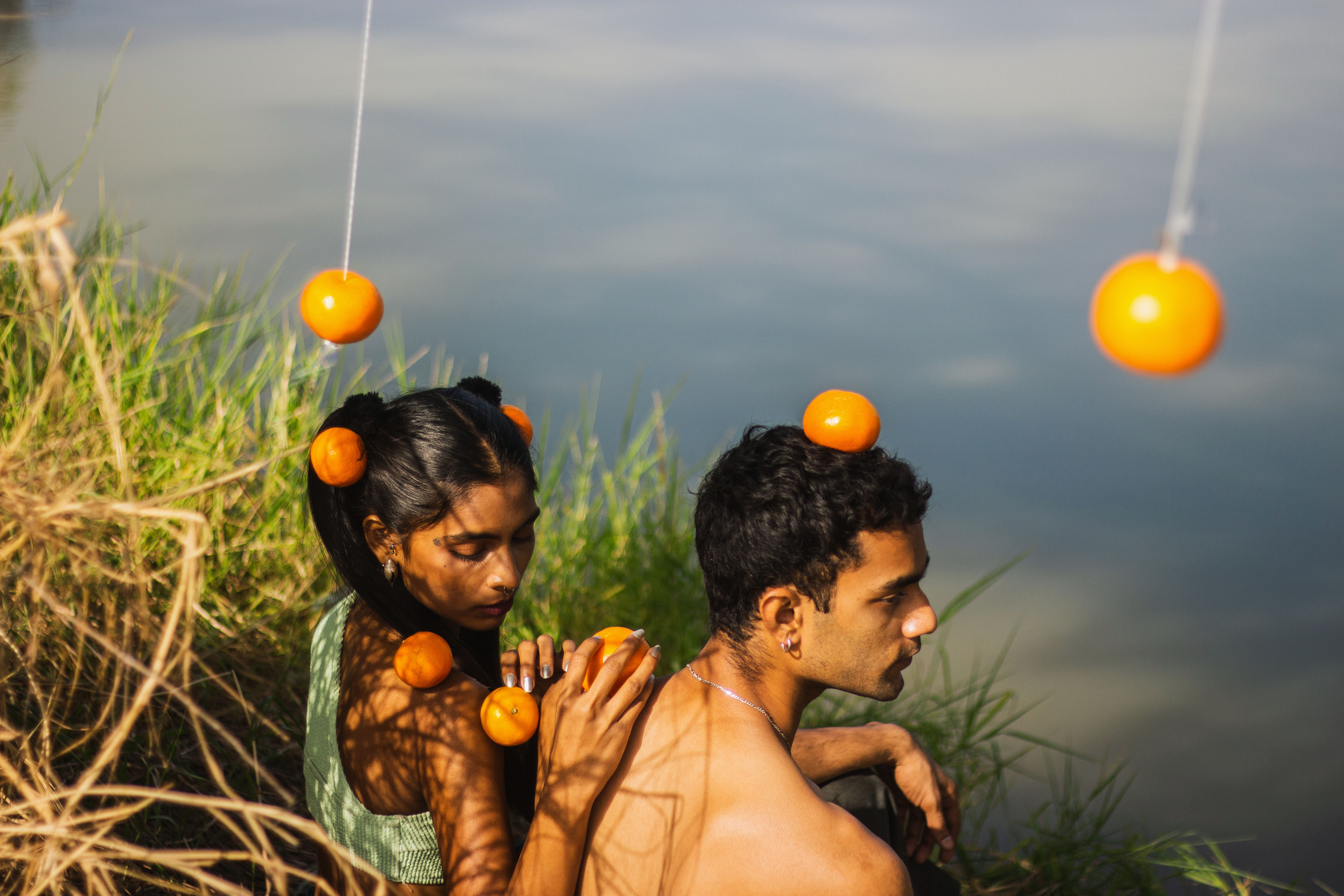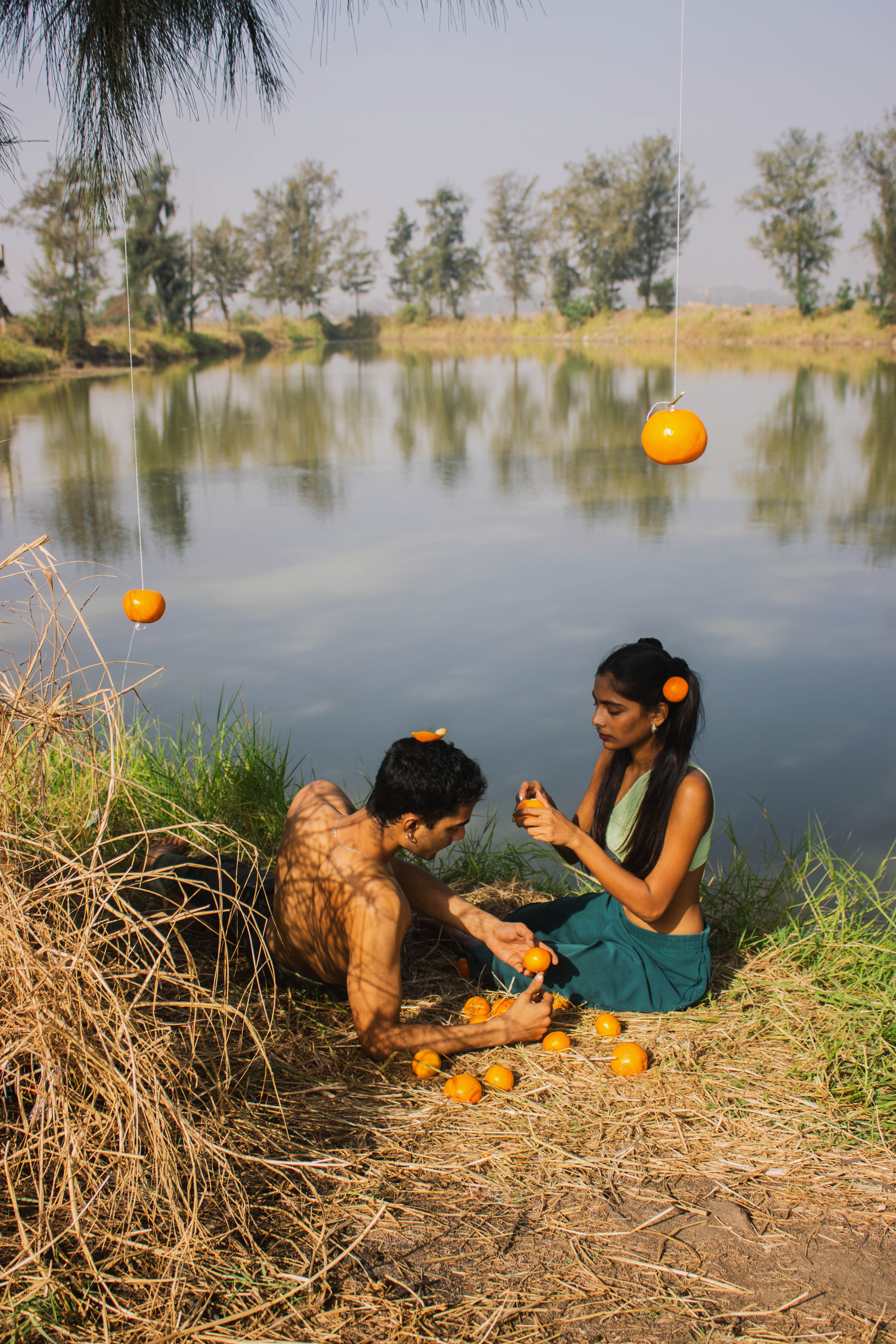 She peels an orange, separates it in