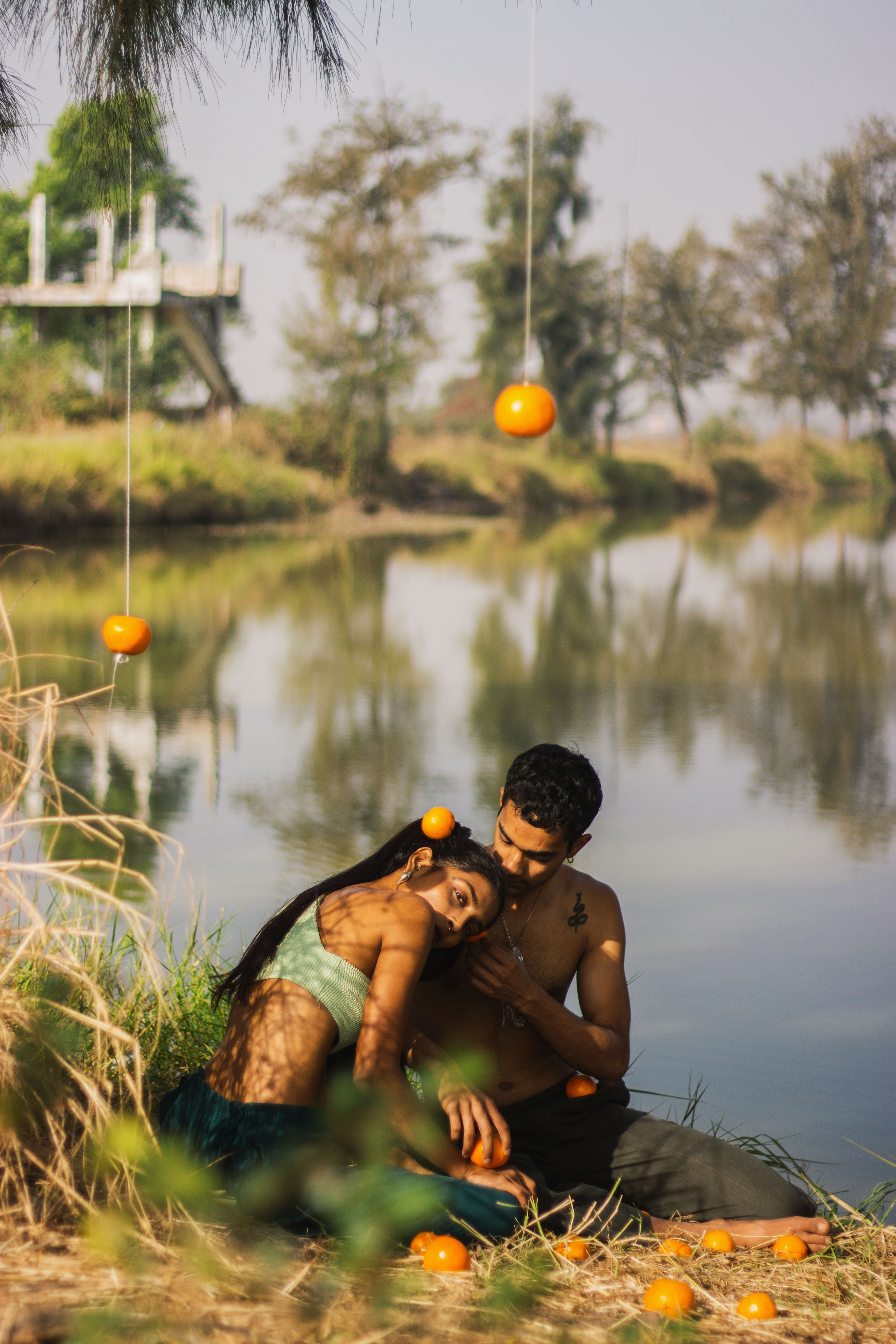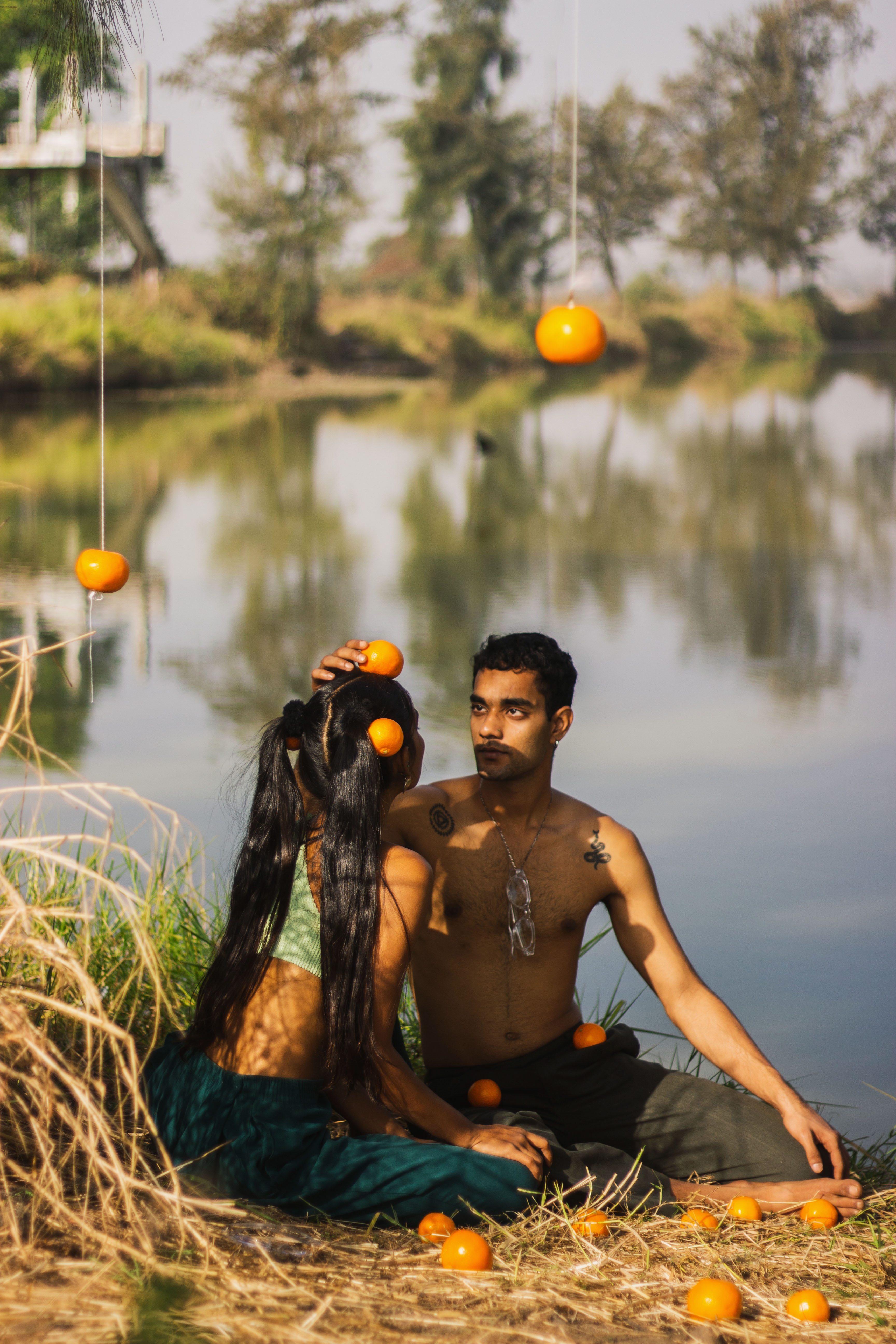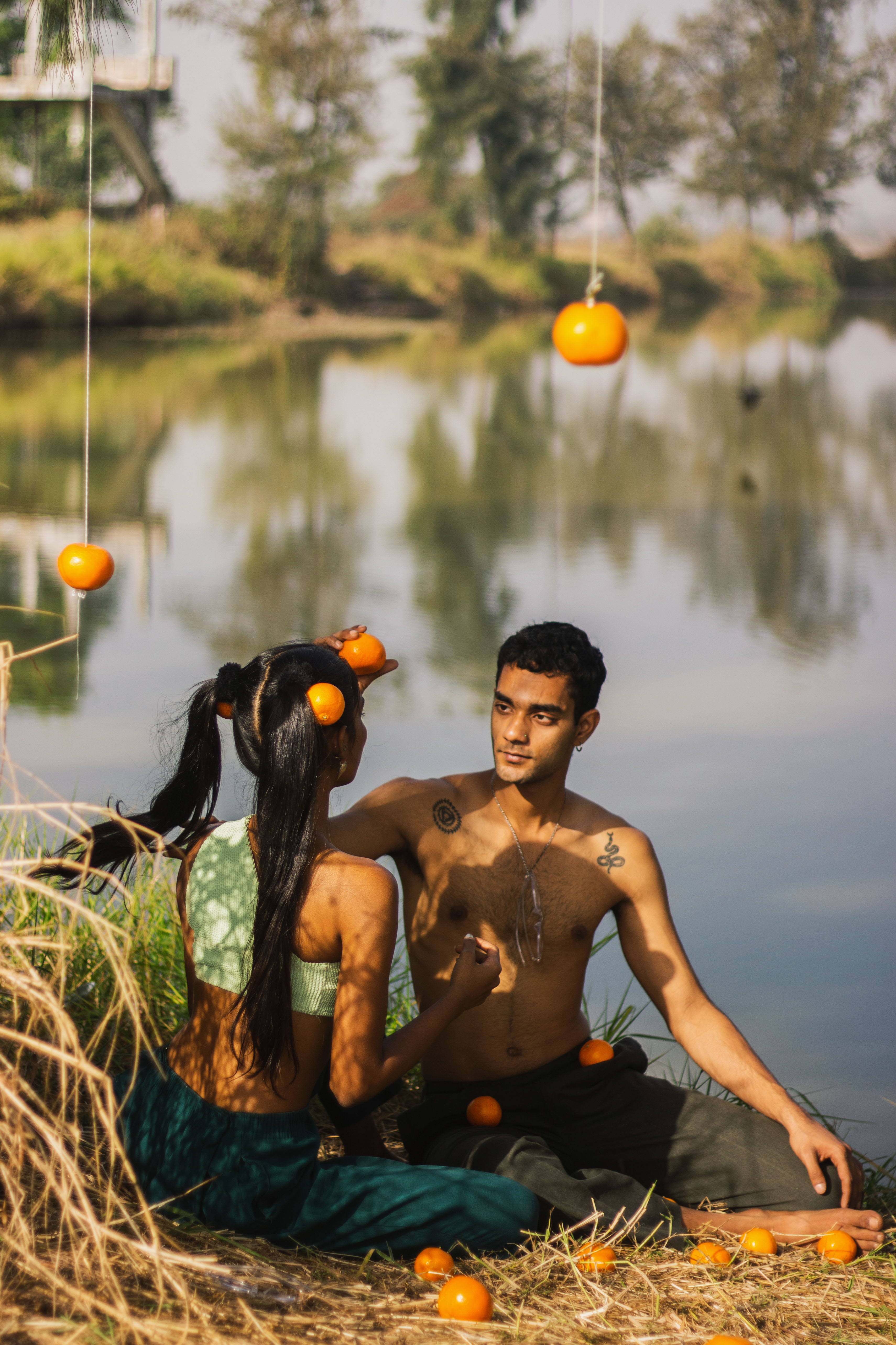 She peels an orange, separates it in